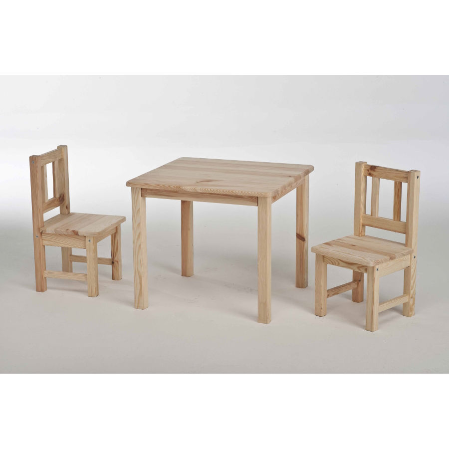 Set per bambini completo di 1 tavolo e 2 sedie con schienale, tutti realizzati in pino massello grezzo.
